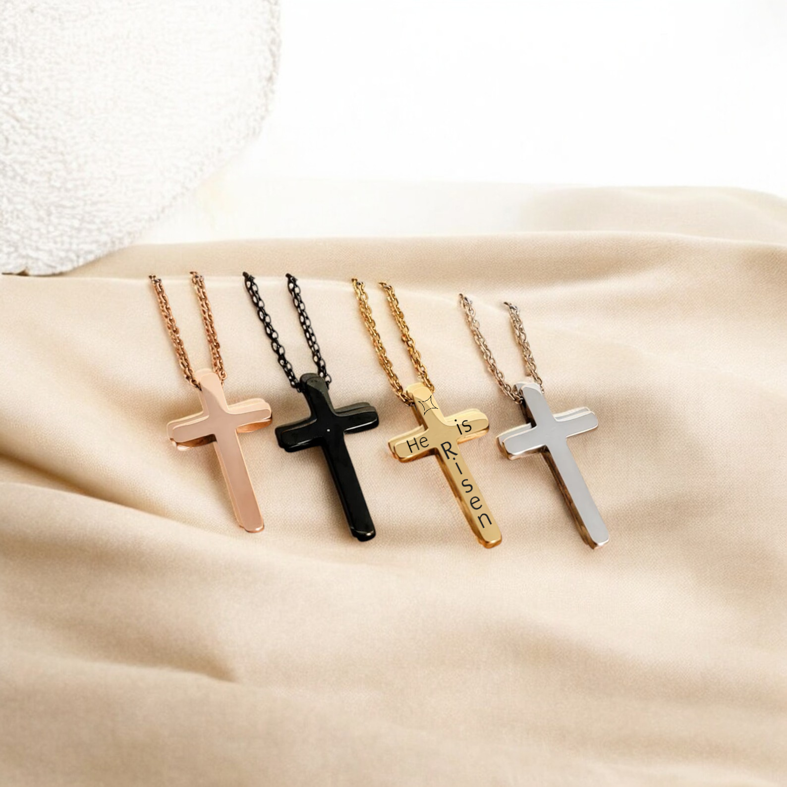 This necklace features a cross that is 17mm wide by 31mm long (each end of the cross is 3.5mm wide by 3.5mm thick) it is available in silver (stainless steel color) or gold, rose gold, or black plating and can be personalized. The pendant is made of stainless steel and has a mirror polished finish for a shiny appearance. Chain is approximately 17.5 inches long Additionally, this necklace is tarnish-resistant, hypoallergenic, and will not fade. Engraved item shown is a mockup, actual item could vary in color. Custom engraved items are not returnable.