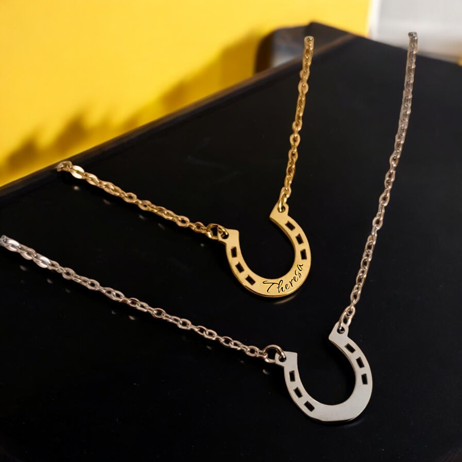 This necklace features a 15mm long by roughly 14mm wide Horseshoe pendant it is available in Gold or Silver and can be personalized. The pendant is made of stainless steel and has a mirror polished finish for a shiny appearance. Chain is approximately 17.25 inches long (plus 2 inch extender) and has a lobster clasp closure. The pendant is about 15mm long by roughly 14mm wide Additionally, this necklace is tarnish-resistant, hypoallergenic, and will not fade. Engraved item shown is a mockup, actual item could vary in color. Custom engraved items are not returnable.