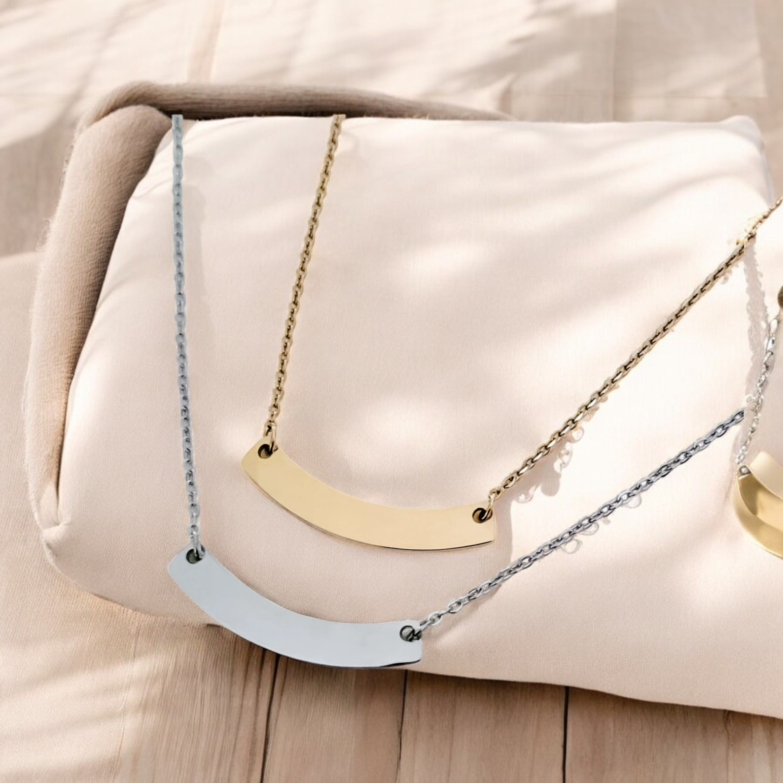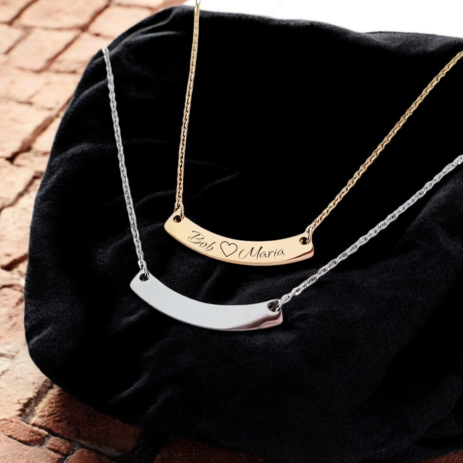 This necklace features a curved bar pendant that is approximately 6 mm x 35 mm, it is available in Gold or Silver and can be personalized. The pendant is made of stainless steel and has a mirror polished finish for a shiny appearance. Chain is approximately 18 inches long (plus 2 inch extender), and has a lobster clasp closure. The pendant bar is roughly 6 mm x 35mm. Additionally, this necklace is tarnish-resistant, hypoallergenic, and will not fade. Engraved item shown is a mockup, actual item could vary in color. Custom engraved items are not returnable.