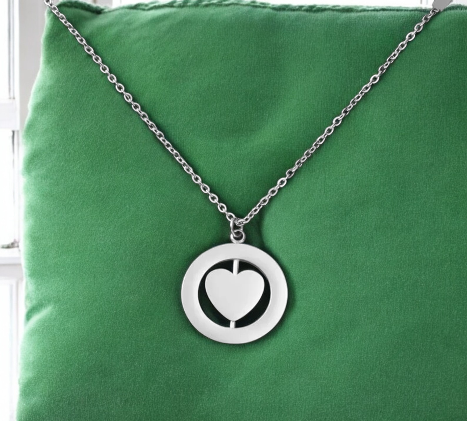 This necklace features an Outer Circle that is roughly 1 inch, and inner heart is roughly 0.6 inches (inner heart rotates), it is available in Gold or Silver and can be personalized. The pendant is made of stainless steel and has a mirror polished finish for a shiny appearance. Chain is approximately 17.25 inches long (plus 2 inch extender), and has a lobster clasp closure. Additionally, this necklace is tarnish-resistant, hypoallergenic, and will not fade. Engraved item shown is a mockup, actual item could vary in color. Custom engraved items are not returnable.