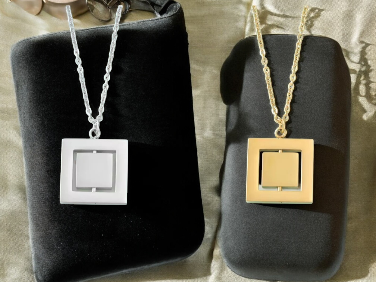 This necklace features an Outer Square that is roughly 1 inch, and Inner Square is roughly 0.6 inches (inner square rotates), it is available in Gold or Silver and can be personalized. The pendant is made of stainless steel and has a mirror polished finish for a shiny appearance. Chain is approximately 17.25 inches long (plus 2 inch extender), and has a lobster clasp closure. Additionally, this necklace is tarnish-resistant, hypoallergenic, and will not fade. Engraved item shown is a mockup, actual item could vary in color. Custom engraved items are not returnable.