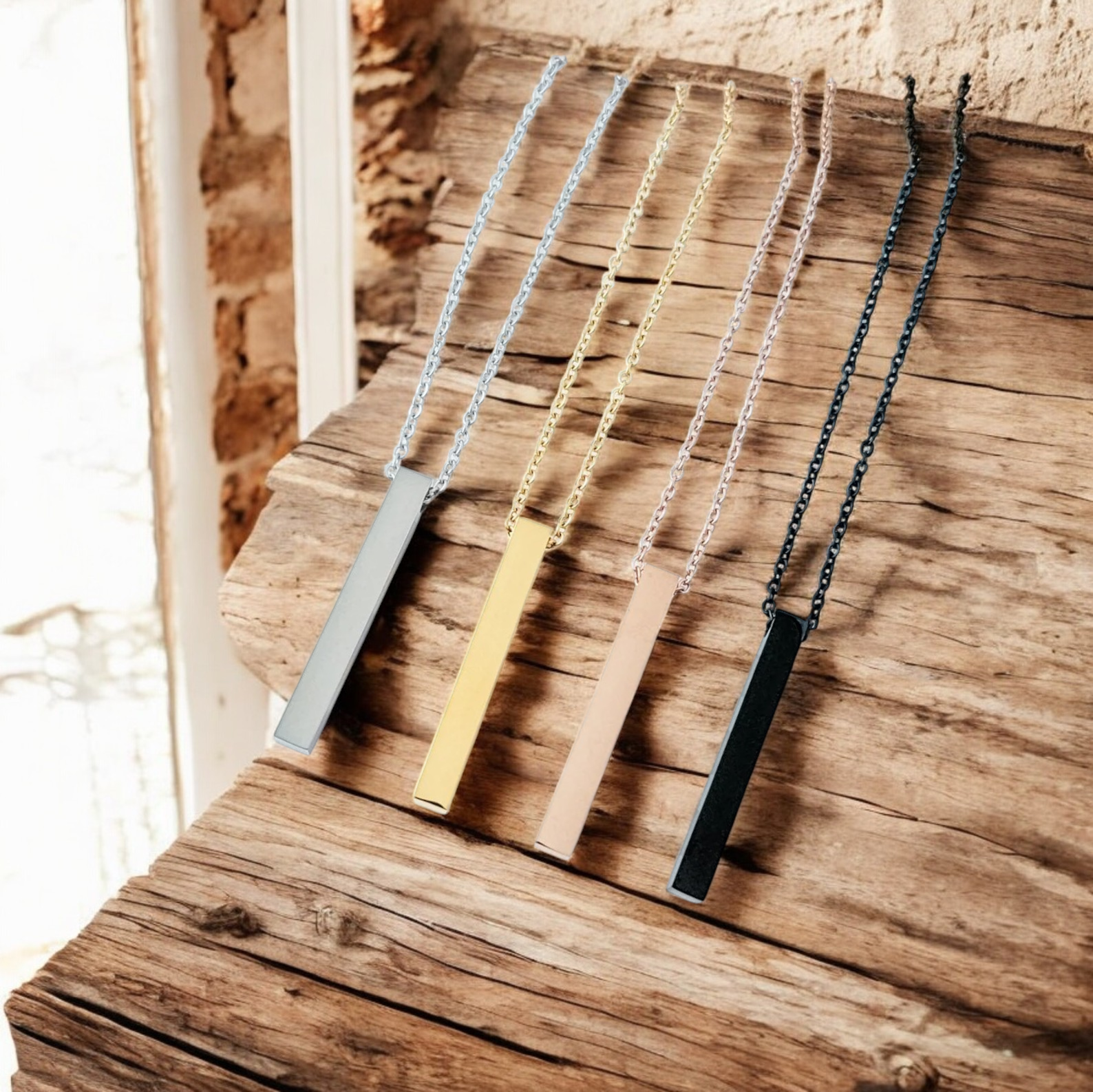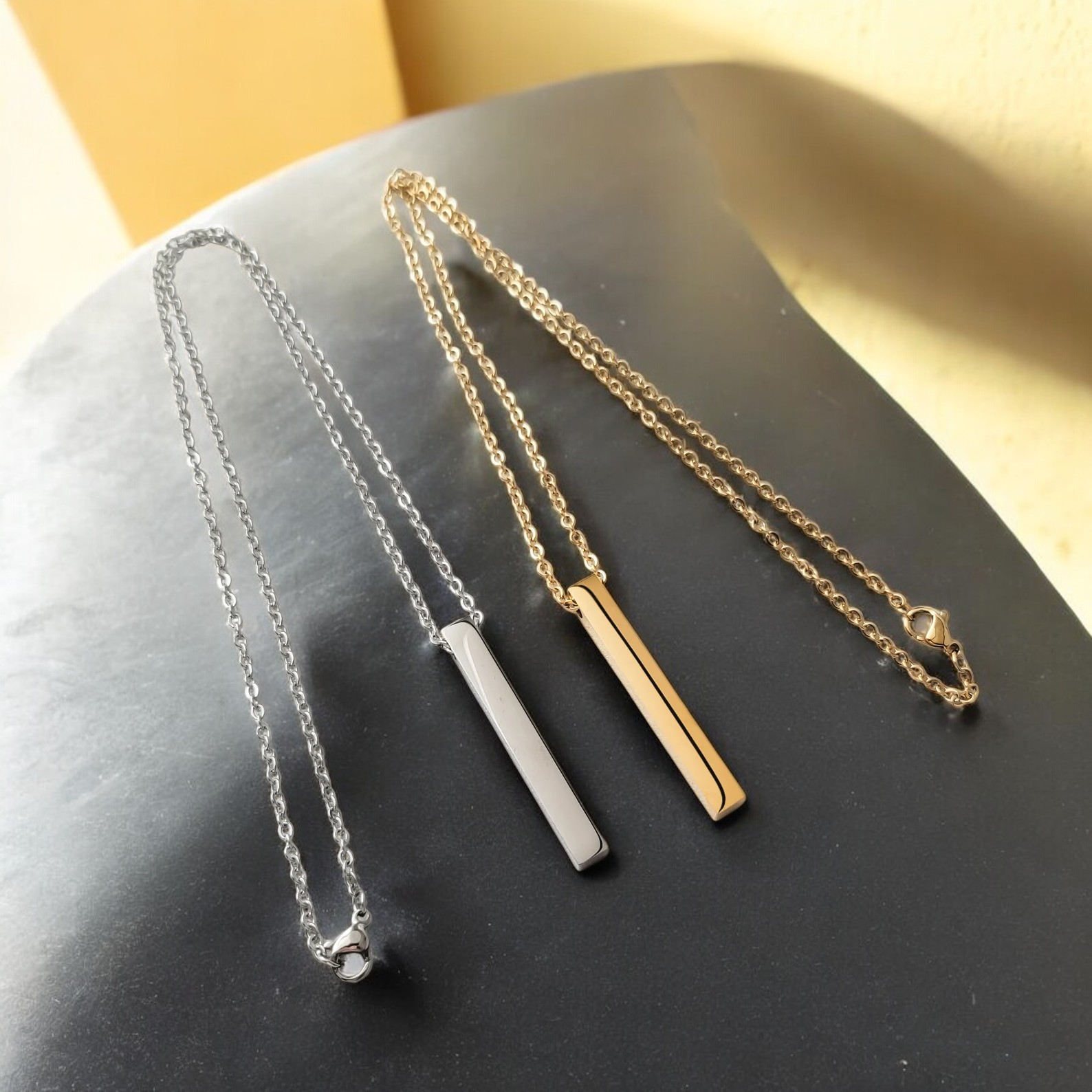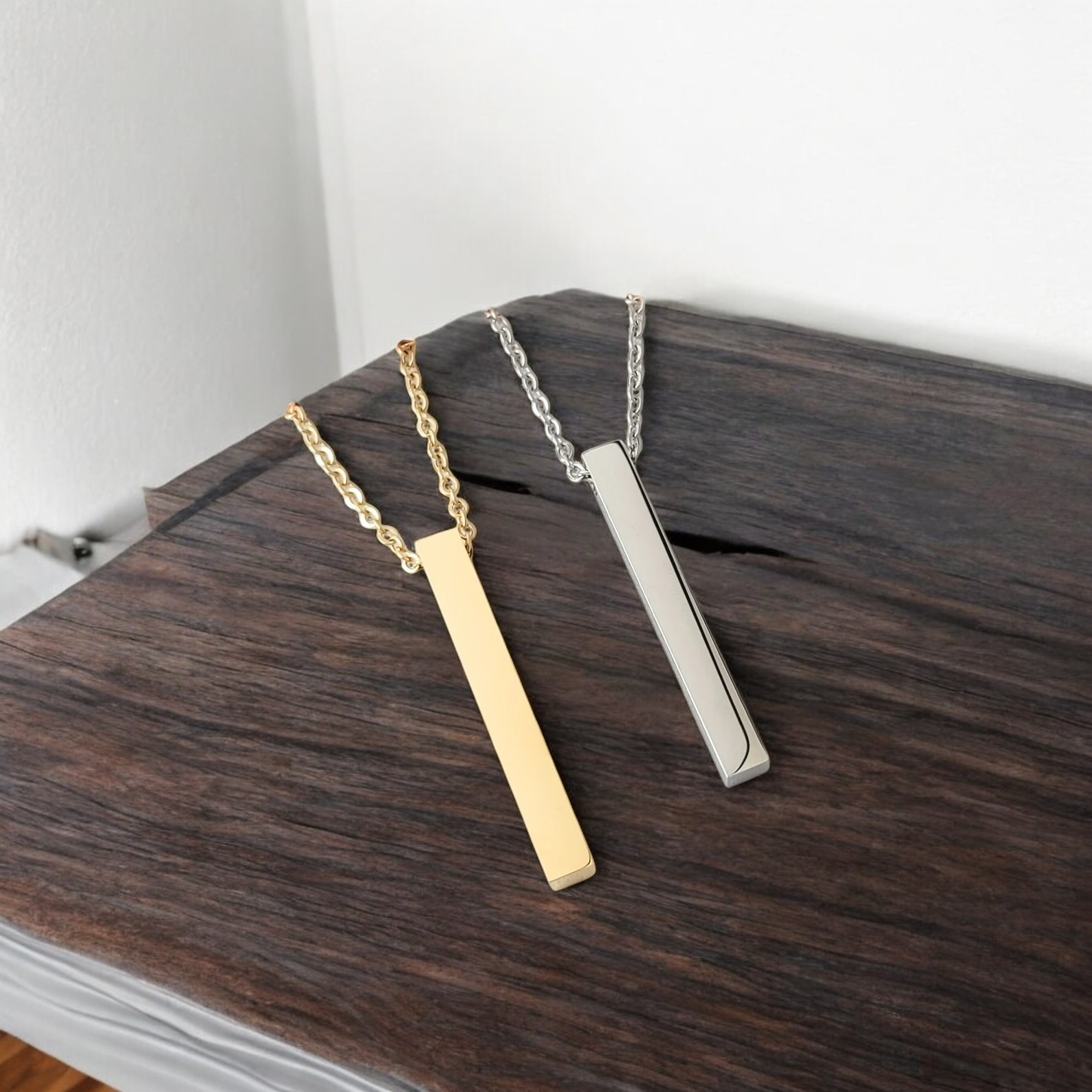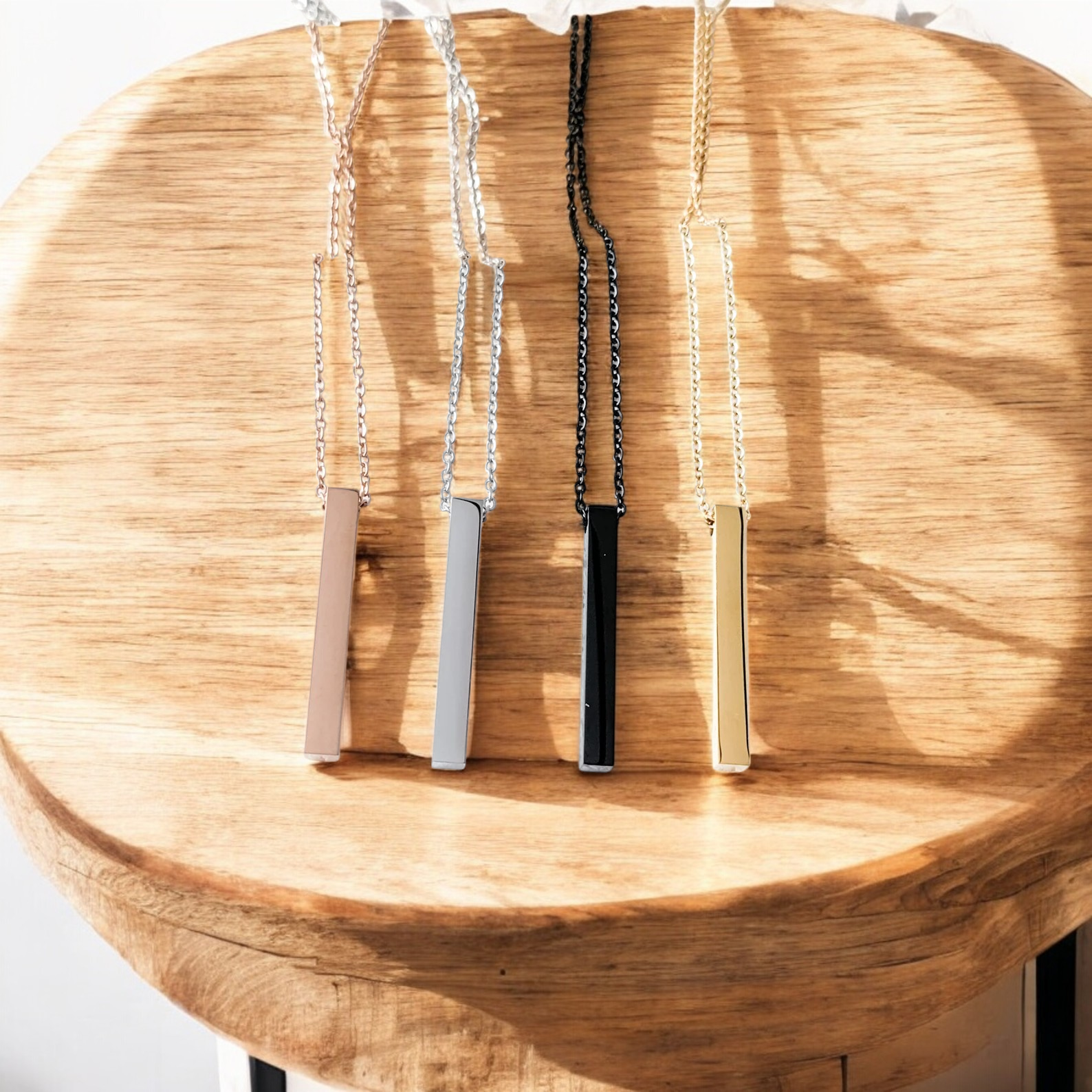 This necklace features a 4 sided rectangle bar that is roughly 5 mm x 40 mm, it is available in silver (stainless steel color) or gold, rose gold, or black plating and can be personalized on all 4 sides. The pendant is made of stainless steel and has a mirror polished finish for a shiny appearance. Chain is approximately 17.5 inches long with a lobster clasp. Additionally, this necklace is tarnish-resistant, hypoallergenic, and will not fade. Engraved item shown is a mockup, actual item could vary in color. Custom engraved items are not returnable.